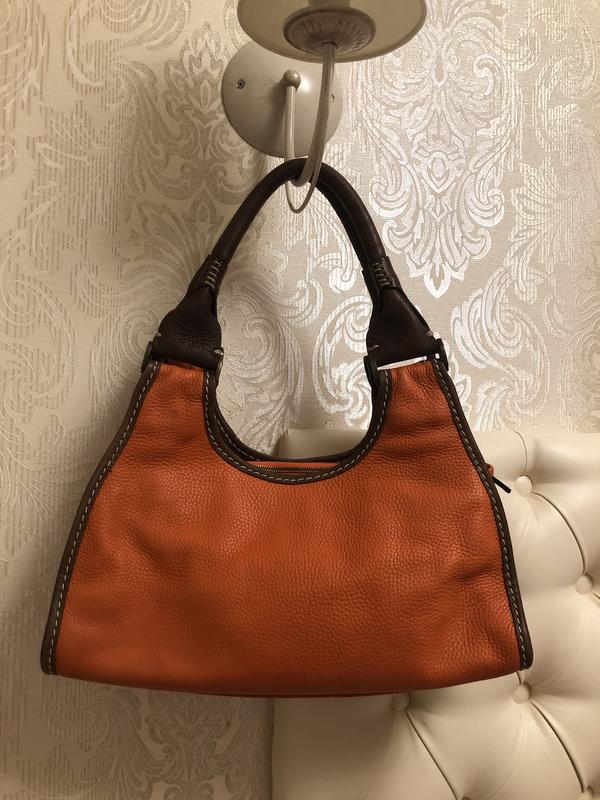 Сумка з натуральної зернистої шкіри Van Bommel. Помаранчевого кольору з коричневою окантовкою. В шкарпетці була пару раз, стан дуже хороший. Заміри за запитом. Обмін і повернення не передбачено.