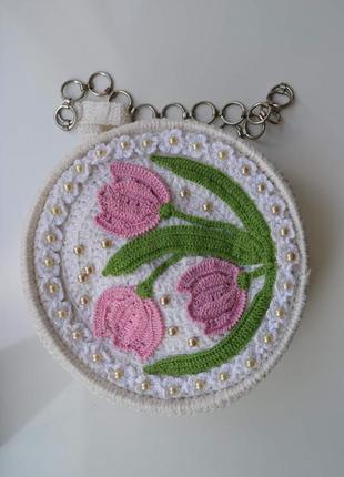 В'язана оригінальна жіноча сумочка. Зверху замок. Оздоблена перлинками.