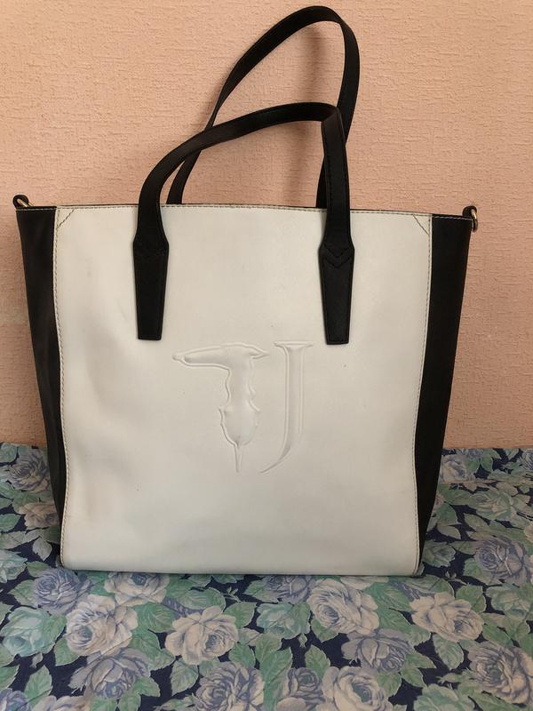 Велика містка сумка італійського бренду Trussardi. Розмір: висота-34см.,ширина-44см.,дно-11*31см. На звороті є невелике плямочка.