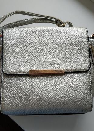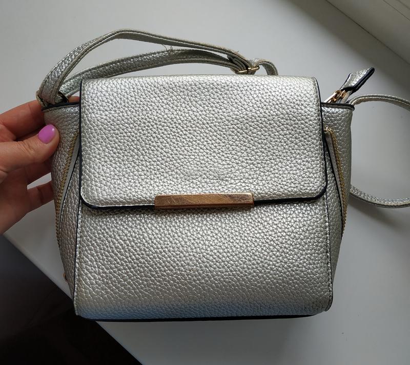 Сумка срібного кольору. Ремішок регулюється. Розміри: висота 18 см, ширина верх 24 см, низ 20 см. Глибина 8 см.