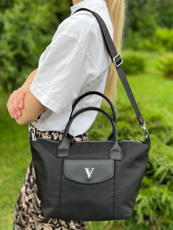 Размер сумки 36 (верх), 23 (низ)*24*14(Длина*Высота*Глубина). Сумка одно общее отделение. Внутри врезной карманчик на молнии и два открытых накладных карманчика. Впереди функциональный карманчик. Сзади врезной карманчик на молнии. Закрывается аксессуар на молнию. Фурнитура серебряного цвета. В комплекте длинный регулируемый ремешок. Сумка фабричного производства, изготовлены из плотной плащевки и эко-кожи.