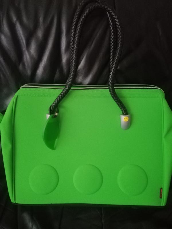 Сумка дорожня, але якщо хтось любить носити великі підійде. Може бути як ділова. Є відділення для паперів, ноутбука. Колір неймовірно гарний, яскравий, кислотно-зелений. Шикарні ручки. Середина з багатьма відділеннями , телефон, карточки д. п. Ширина по низу 47см. высота 36см. Ширина 15см. Стан ідеальний.