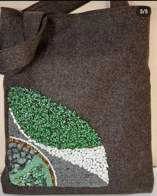 Размер: 42 см × 36 см, высота ручек 30 см. Застегивается на магнитную кнопку Сумка расшита в технике бисерный мох. Материалы: сукно шинельное, металлическая фурнитура; бисер, хрустальные бусины, бусины и крошка натуральных камней: агат, флюорит, лунный камень, тигровый глаз