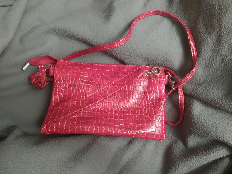 Нарядная сумка, тёмно-алого яркого цвета з золотыми прожилками. Для передачи цвета отдельное фото. Типа как лаковая. Размер 24х16 см. А толщину 4,5 см. Вместительная, три самостоятельных отделения. Ремешок регулируется, можно сделать длинным.