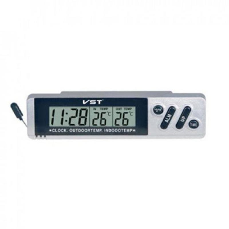 Автомобильные часы с термометром VST-7067 Автомобильные часы VST-7067 являются многофункциональным прибором, объединяющим в себе часы, будильник, автомобильный термометр и уличный термометр. Несмотря на такую универсальность, прибор имеет компактные размеры, легко встраивается в панель приборов автомобиля. Жидкокристаллический дисплей, отличается высоким качеством материалов и изготовления, несмотря на небольшую цену часов. Индикация на экране цифровая. Экран поделен на три зоны, в первой отображается время или дата (переключается одной из кнопок управления), вторая и третья содержат показания температурных датчиков (внутреннего и наружного). Термодатчиков в тих часах два, один измеряет температуру воздуха внутри салона, второй снаружи. Измерения производятся в реальном времени, каждые 20 секунд данные о температуре обновляются автоматически. Внешний термодатчик крепится на авто снаружи, в любом удобном месте, с прибором соединяется с помощью длинного двухметрового провода. Переключение между Цельсием и Фаренгейтом. Цифровые часы для авто могут показывать время в двух временных режимах: 12 или 24 часа. Эта функция выбирается пользователем. Часы дополнены будильником, настроив время будильника, Вы услышите звуковой сигнал в необходимый для Вас момент. Будильник имеет функцию отсрочки сигнала, она позволяет повторить сигнал через небольшой отрезок времени. Авточасы работают от пальчиковой батарейки 1,5В. Технические характеристики часов автомобильных VST 7067: Размер часов: 120*34*34мм Размер дисплея: 58,5 * 20 мм Отображение часы / минуты Будильник со звуковым сигналом Отображение температуры на дисплее внутренней и внешней Напряжение питания: 1,5 Вольт Измерение температуры в салоне и снаружи, Рабочая температура: -50 +40 градусов. Точность +/- 0.1 градус. Время измерения температуры: 20 секунд Комплектация: Часы Термодатчик на проводе Инструкция Коробка
