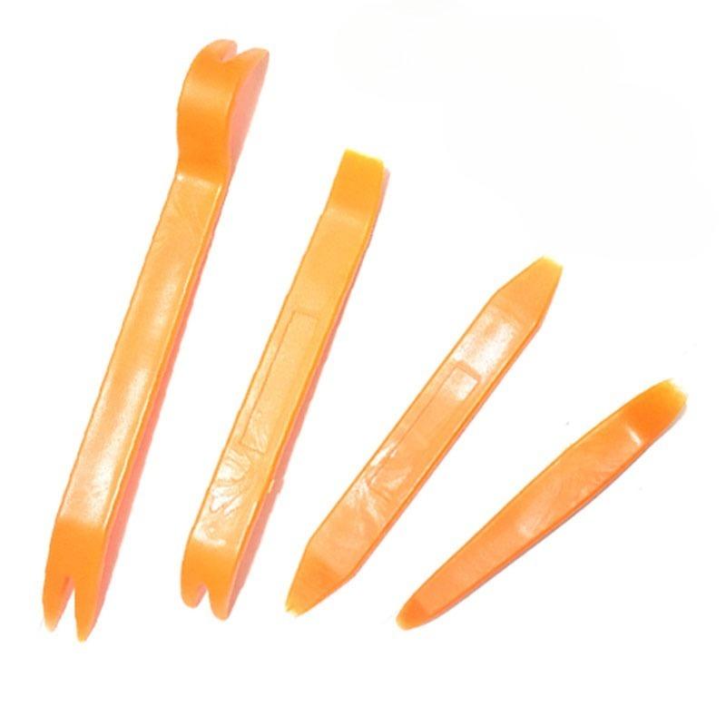 Набор инструментов для разборки внутренней обшивки и снятия приборной панели. С помощью набора легко и безопасно снимать радиопанель, обшивку, молдинг, дверные панели и приборную панель. Набор уменьшает вогнутые и выступающие рубцы, что остаются при использовании других неэффективных инструментов. Элементы изготовлены из прочного пластика. Технические характеристики: Материал: ABS Цвет: желтый Размер: 22 * 2 * 0,6 см, 19 * 2 * 0,6 см, 14 * 2 * 0,6 см, 16 * 2 * 0,6 см Количество: 4 шт