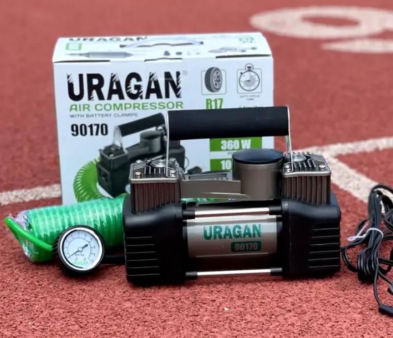 Японский компрессор для подкачки шин, Электронный насос для машины (85л/мин 10Атм двухпоршневой), NST Автомобильный компрессор Uragan - это классический компрессор с двумя поршнями повышенной мощности и питанием от клемм АКБ, что дает возможность ему накачать шины, лодки и любой спортивный инвентарь в два раза быстрей, чем любому другому автокомпрессору. отличается наличием мощного двухцилиндрового мотора. Рабочее напряжение компрессора: 12В (бортовая сеть автомобиля). Встроенный предохранитель на 30 А защитит устройство в случае неправильного подключения или перебоев в электросети. Шланг высокого давления длиной 5.7 м оснащен манометром, что позволит Вам контролировать показатели давления и без проблем, дотянутся до любого колеса Вашего автомобиля. Благодаря комплекту насадок компрессор также может быть использован для накачивания надувных лодок, мячей, матрацев и т.п. Корпус компрессора полностью выполнен из металла. Прочная ручка имеет мягкое покрытие для удобства захвата. Основание компрессора оснащено четырьмя амортизирующими опорами, которые значительно понижают уровень шума, сведя всю вибрацию на нет. В комплектацию входит набор адаптеров, а также прочная сумка из водонепроницаемой ткани. Особенности: - Зажимы на АКБ с предохранителем - Высокоточный манометр с спускным клапаном - Мощный электродвигатель - Два металлических поршня с шатуном и подшипниковой парой Характеристики: - мощность 360Вт; - производительность 85 л/мин.; - нагнетаемое давление - 10 Атм; - продолжительность непрерывного функционирования 40мин.; - потребляемый ток 30 А; - точный аналоговый манометр; - термостойкость от -40 до +80 °C; - воздушный шланг 5.7 м. Комплектация: - Компрессор - Запасной предохранитель - Шланг 5,7м с манометром и спускным клапаном - Два адаптера - Насадка-игла - Инструкция - Сумка футляр