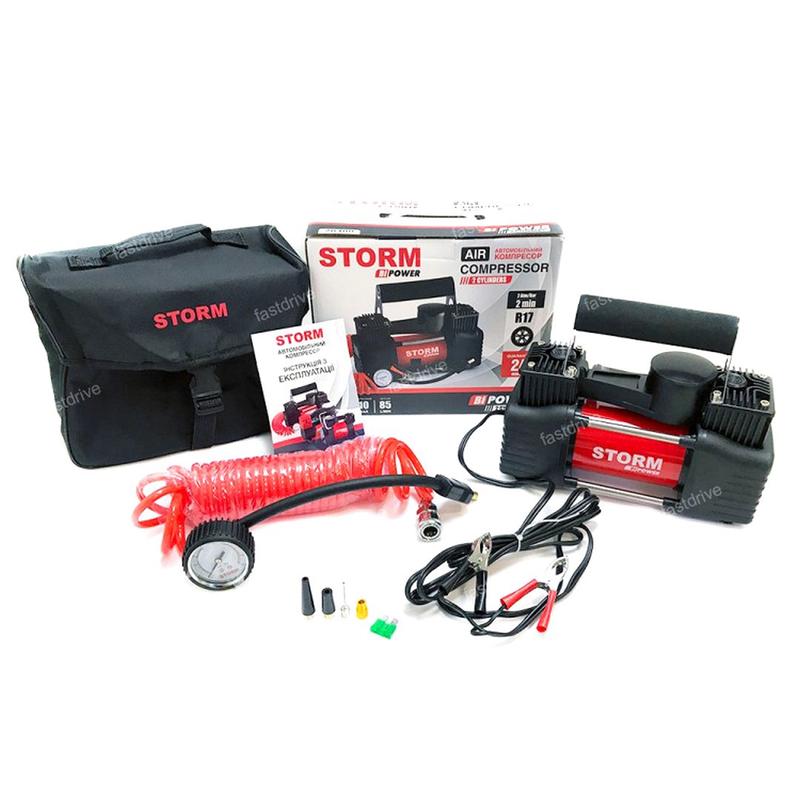 Насос для машины, Компрессор для шин (85л/мин 10Атм), Насос для авто, Насос для автомобиля, NST Автомобильный компрессор STORM подойдет для закачки шин легковых автомобилей с напряжением электросети 12 вольт. Устройство способно выдавать максимальное давление в 10 атмосфер, этого достаточно для бытовых целей. Потребляемая мощность компрессора составляет 360 Ватт. Высокое качество исполнения Корпус компрессора изготовлен из комбинации металла и пластика. Сверху есть удобная ручка для переноски. На ножках есть специальные резиновые демпферы, гасящие вибрацию в процессе работы аппарата. Отдельно хочется отметить небольшие размеры и небольшой вес компрессора, что вместе с высокой производительностью и надежностью делает данную модель очень удобной и практичной в эксплуатации. Кабель для подключения к сети автомобиля имеет длину 3 метра, этого достаточно для комфортного использования. Время непрерывной работы составляет 15 минут. Характеристики: - Производительность за 0 бар: 85 л/мин - Напряжение: 12 В - Максимальное давление: 10 Атм - Максимальный потребляемый ток: 30 А - Температура эксплуатации: -40 до +80 °C - Длина шнура питания: 3 м - Длина шланга подачи воздуха: 5.7 м Дополнительные характеристики: - 2-цилиндровый с зажимами АКБ - Мощность: 150 Вт - Производительность: 85 л/мин - Для радиуса: 17 R - Скорость загрузки: 2 Атм в 2 мин Комплектация: - Оснащен высокоточным манометром - Надежная сумка из высококачественного материала для хранения - Зажимы для АКБ с предохранителем - Комплект сменных насадок с запасным предохранителем Размеры: 140 х 210 х 260 мм Вес: 2.25 кг