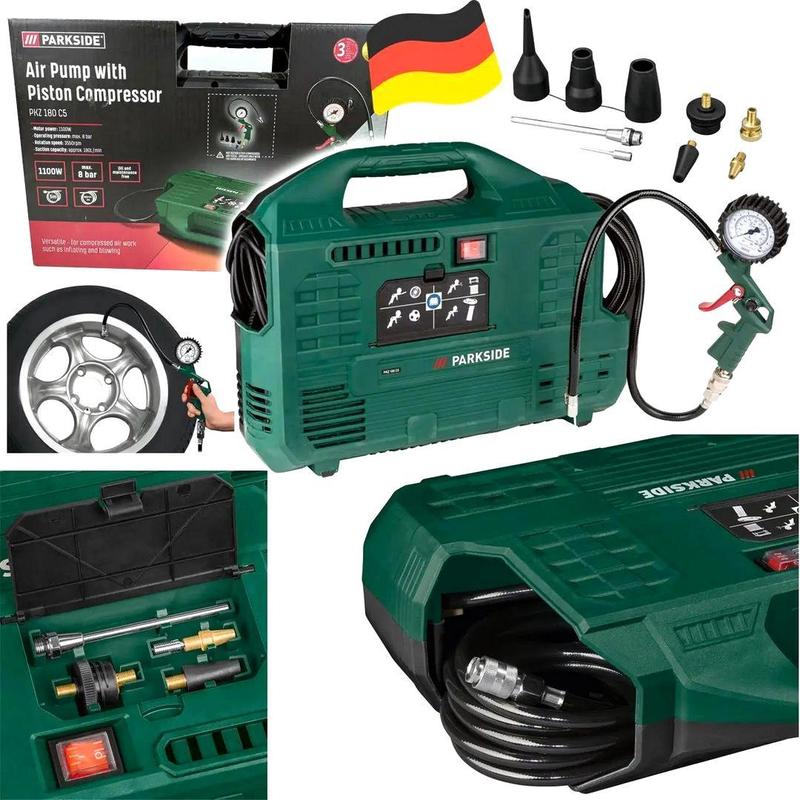 Насос для машины, Насос для авто, Компрессор для шин (180л/мин 8бар) Parkside, Насос для автомобиля, NST - множество возможностей применения при работе со сжатым воздухом, например, наполнение и продувка - эффективный электродвигатель позволяет легко и быстро повысить давление - необслуживаемая работа без использования масла - прочный корпус с ручкой и ножками - переключатель включения/выключения со световым индикатором - спиральный шланг для сжатого воздуха с разъемом - встроенный отсек для аксессуаров - без бака В комплект входят: - 1 пистолет с манометром - 1 шланг с быстродействующим рычагом - набор из 9 фитингов и насадок для всех возможных применений. Технические данные : - мощность двигателя: 1100 Вт - рабочее давление: максимум 8 бар - обороты: 3550 мин-¹ - мощность всасывания: около 180 л/мин - Материал: пластик, металл Размеры : - компресор: 46,4 х 34,7 х 13,8 см - Пистолет давления с манометром: примерно 24 х 7,65 см. - длина сетевого кабеля: около 5 м - длина кабеля сжатого воздуха: около 3 м Предупреждения: - Не подходит для пневматических инструментов - используйте только с навесными приспособлениями. Пожалуйста, следуйте инструкциям по безопасности, указанным в инструкции по эксплуатации.