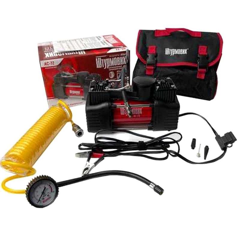 Компрессор для накачки шин 12в (90л/ 150psi/ 25Amp), Портативный автомобильный воздушный компрессор, NST Компрессор автомобильный Штурмовик разработан профессионалами автомобильного рынка специально для украинских покупателей. Линейка компрессоров Штурмовик - это возможность для покупателя платить только за качественный товар внутри, а не за упаковку. Эти идеи были воплощены в компрессоре Штурмовик. Под металлическим корпусом скрыт 2-х цилиндровый электродвигатель поршневого типа с производительностью 90л/мин и мощностью 300Вт, потребляющий 25А постоянного 12В тока от клемм АКБ автомобиля. Качественные комплектующие позволяют за 2-3 минуты накачать колесо вашего автомобиля и сохраняют производительность даже при высоком стартовом давлении накачиваемого колеса. Комплектуется витым PU шлангом длиной 5,0м с манометром и клапаном DEFLATOR для точной регулировки давления. Модель является самой мощной в линейке и рекомендована для колес автомобиля с радиусом R15-18. - Вид компрессора: двухпоршневой - Дополнительный функционал: дефлятор - Сумка для переноски и хранения: да - Производительность, л/мин:40-60 - Дополнительная комплектация: переходник для спортинвентаря - Страна происхождения: Україна - Тип компрессора: поршневой - Рекомендован для колес: R15 - R18 - Максимальное давление, атм:10 - Торговая марка: ШТУРМОВИК - Тип подключения: клеммы АКБ - Ресивер: нет - Манометр: аналоговый - Max давление: 150psi (10Атм) - Производительность: 90 л/мин - Подключение: клеммы - Потребляемый ток: 25A - Длина шланга: 5м - Примечание: 2 циллиндра Технические характеристики: - Напряжение: 12В - Мах потребляемый ток: 25А - Max давление: 150psi (10 Атм) - Производительность: 90 л/мин - Подключение: клеммы АКБ - Мощность: 300Вт Комплектация: - компрессор - воздушный шланг PU c манометром - сумка для хранения - инструкция с гарантийным талоном - комплект адаптеров.