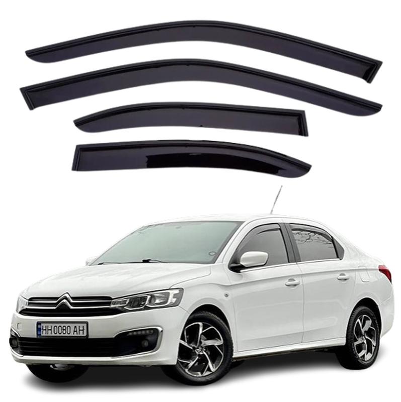 Боковые дефлекторы окон Citroen C-Elysee, Peugeot 301 Седан 2013-> на скотче, ветровики на окна Дефлектор - это специальный аксессуар, который устанавливается на окна, капот автомобиля. Он отсекает встречный ветер, чем улучшает аэродинамику при движении машины. Ветровики или мухобойки, так в народе называют дефлекторы, изменяют траекторию движения воздушных потоков и защищают авто от механических повреждений. Усовершенствуйте ваш автомобиль с помощью дефлекторов боковых окон. Они позволяют вам наслаждаться свежим воздухом независимо от погоды, не пропуская шум ветра и дождя, и даже позволяют парковаться с приоткрытыми окнами, чтобы летом было прохладнее. Являются спасением для курильщиков в холодную погоду. Боковой дефлектор должен также иметь стильный дизайн, чтобы добавить эстетическую ценность вашему автомобилю. Ветровики это полезный аксессуар, щей дополнительно тюнингует автомобиль. Дефлекторы окон необходимы, если: - В дождь запотевает лобовое стекло, и необходимо открыть окно; - Хочется свежего воздуха в салоне, но так чтобы без сквозняков; - Чтобы открывая окно в непогоду, дождь и снег не попадали в салон; Качество ветровиков будет зависеть от материала из которого они изготовлены, и качества элементов крепления. Существует два вида монтажа: накладные (на двухсторонний скотч) или вставные (монтируются в паз, в который входит стекло).