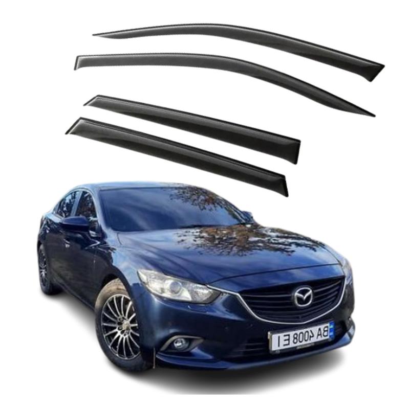 Дефлекторы на боковые окна (Ветровики) Mazda 6 седан 2012-> (3м Скотч) Дефлектор - это специальный аксессуар, который устанавливается на окна, капот автомобиля. Он отсекает встречный ветер, чем улучшает аэродинамику при движении машины. Ветровики или мухобойки, так в народе называют дефлекторы, изменяют траекторию движения воздушных потоков и защищают авто от механических повреждений. Усовершенствуйте ваш автомобиль с помощью дефлекторов боковых окон. Они позволяют вам наслаждаться свежим воздухом независимо от погоды, не пропуская шум ветра и дождя, и даже позволяют парковаться с приоткрытыми окнами, чтобы летом было прохладнее. Являются спасением для курильщиков в холодную погоду. Боковой дефлектор должен также иметь стильный дизайн, чтобы добавить эстетическую ценность вашему автомобилю. Ветровики это полезный аксессуар, щей дополнительно тюнингует автомобиль. Дефлекторы окон необходимы, если: - В дождь запотевает лобовое стекло, и необходимо открыть окно; - Хочется свежего воздуха в салоне, но так чтобы без сквозняков; - Чтобы открывая окно в непогоду, дождь и снег не попадали в салон; Качество ветровиков будет зависеть от материала из которого они изготовлены, и качества элементов крепления. Существует два вида монтажа: накладные (на двухсторонний скотч) или вставные (монтируются в паз, в который входит стекло).