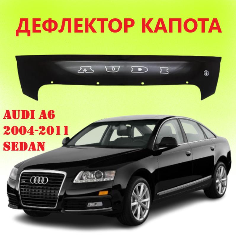 Дефлектор на капот Audi A6 (4F\C6) Sedan 2004-2011 Мухобойка на капот Ауди А6 седан 2004-2011 VIP-Tuning Дефлектор капота представляет собой накладку из пластика в виде щитка и устанавливается на переднюю часть капота. Основной функцией этого аксессуара является защита автомобиля от повреждений камешками и другими мелкими предметами, вылетающими на большой скорости из-под колес впереди идущих автомобилей. Дефлектор капота представляет собой модельный аксессуар, который не только улучшает внешний вид автомобиля и придаёт шарм его экстерьеру, но и выполняет защитную функцию (он защищает лобовое стекло и капот от механических повреждений мелким дорожным мусором, насекомыми и т. д). - Это защитная накладка, которая по форме повторяет переднюю часть капота автомобиля. Ее основной функцией является защита капота и стекла автомобиля от механических повреждений, а именно от ударов мелких камней, веток песчинок и других предметов, которые часто встречаются на дороге. Также смотрите другие наши товары