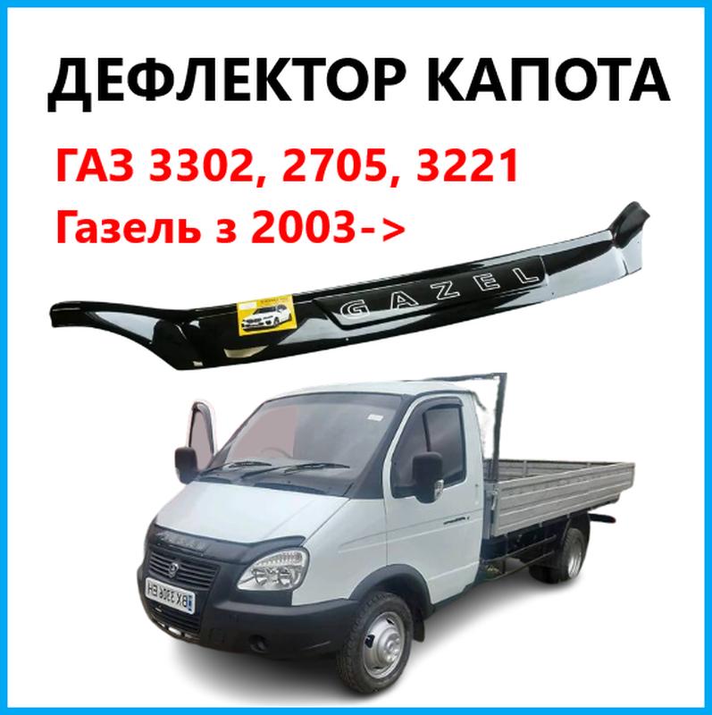 Дефлектор на капот ГАЗ 3302, 2705, 3221 Газель с 2003-> (нового варианта) Мухобойка на капот ГАЗЕЛЬ Дефлектор капота представляет собой накладку из пластика в виде щитка и устанавливается на переднюю часть капота. Основной функцией этого аксессуара является защита автомобиля от повреждений камешками и другими мелкими предметами, вылетающими на большой скорости из-под колес впереди идущих автомобилей. Дефлектор капота представляет собой модельный аксессуар, который не только улучшает внешний вид автомобиля и придаёт шарм его экстерьеру, но и выполняет защитную функцию (он защищает лобовое стекло и капот от механических повреждений мелким дорожным мусором, насекомыми и т. д). - Это защитная накладка, которая по форме повторяет переднюю часть капота автомобиля. Ее основной функцией является защита капота и стекла автомобиля от механических повреждений, а именно от ударов мелких камней, веток песчинок и других предметов, которые часто встречаются на дороге. Также смотрите другие наши товары