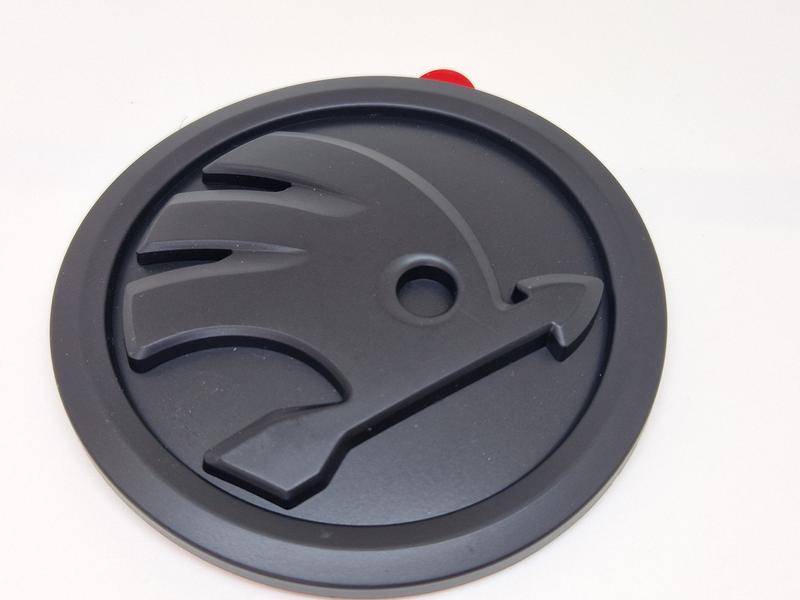 Эмблема Skoda нового образца. Код: 5ED853621 Диаметр: 100мм. Изогнутая, с обратной стороны 3 направляющих