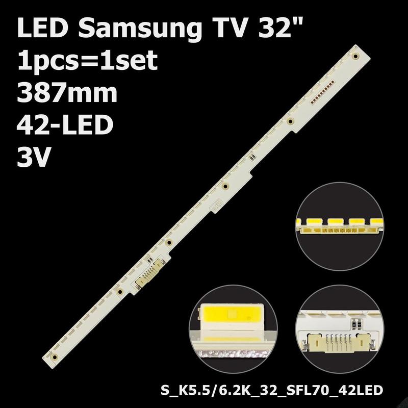 Артикул: ART-13011 Тип підкладки: алюміній Довжина планок: 387 мм Ширина планок: 14-19 мм Напруга одного світлодіода: 3V Кількість контактів на роз'ємі: 6 pin Кількість світлодіодів на планці: 42 LED Відстань між світлодіодами по центру: 9 мм Маркування планок: - S_K5.5/6.2K_32_SFL70_42LED_REV1.0_160110_LM41-00297A (V6EY-320SM0-LED42-R4) - S_K5.5/6.2K_32_SFL70-42LED REV1.0 LM41-00297A Підсвітка підійде до моделей: - Samsung: UE32M5670, UE32K5579, HG32EE690DB, HG32EF690DB, UE32K5500, UE32K5500AU, UE32K5500AW, UE32K5500BU, UE32K5550AU, UE32K5550BU, UE32K5672SU, UE32M5500AU, UE32M5502AK, UE32M5572AU, UE32K5600, UE32M5525, UE32M5650, UE32M5522AK, UE32M5620AK, UE32M5525AK, UE32K5600AK, UE32K5500AK, UE32K6550BUXRU, UE32K6550AUXRU, UE32M6550AUXCE, UE32M5550AUXRU, HG32EE694DKXXU, UA32K6000ARXMM, UE32K5679SUXZG, UE32K5672SUXXH, UE32M6305AKXXC, UE32M5522AKXXH, HG32AF690DJXXZ, UA32K6500BKXWT, UE32K5659SUXZG, UE32K5650SUXZG, UE32M5670ASXXN, UE32M5570AUXZG, UN32K6500AGXZB, UA32K6500BRXTW, UE32K6000AUXSQ, UE32K5500AUXCE, UE32M5582AUXXH, UN32K6200AFXKR, UA32K6000ARXUM, UE32K5670SSXXN, UE32K5500AKXXC, UE32M5500AUXCE, UE32M5500AUXUA, UN32K5500BFXKR, UA32K6500AKXGH, UE32K5605AKXXE, UE32K5600AKXXC, UE32M6000AUXSQ, UE32M5602AKXXH, UN32K6500AHXPA, UA32K6500AKXSK, UE32K6370SUXXC, UE32K5500AWXXN, UE32M6300AWXXN, UE32M5500AKXZT, UN32K6500AGXZS, UA32K6500ARXMM, UE32K6370SSXXN, UE32K5500BUXUA, UE32M6300AKXZT, UE32M6300AKXXU, UN32K6500AGXPE, UA32K6800AJXXZ, UE32K5500AKXZF, UE32K5510AKXXU, UE32M5690ASXXN, UE32M5672AUXXH, UN32K6250AFXZA, UA32K6300AKXXV, UE32K5500AUXRU, UE32K5550BUXRU, UE32M5650AUXZG, UE32M5632AUXZG, UN32K6250AFXZC, UA32M6500ASXMV, UE32K5670SUXZG, UE32K5502AKXXH, UE32M6320AKXXU, UE32M6320AKXZT, UN32K6500AKXZL, UA32K5500AGXXP, UE32K6000AUXTK, UE32K5510AUXRU, UE32M6503AUXRU, UE32M6500AUXUA, UN32K5500AGXZB, UA32K5520AKXXV, UE32K5500AUXUA, UE32K5515AKXXE, UE32M6500AUXMI, UE32M6500AUXCE, UN32K6500AGXZD, UA32K6300ARSRS, UE32K6300AWXXH, UE32K6379SUXZG, UE32M6372AUXXH, UE32M6322AKXXH, UN32K6500AFXZX, UA32M6500AKXRQ, UE32K6300AKXXC, UE32K6500AUXTK, UE32M5605AKXXC, UE32M5515AKXXC, UN32K6550AFXZX, UA32M6000ARXMM, UE32K6300AKXZT, UE32K6500BUXUA, UE32M5510AUXUA, UE32M5510AUXRU, UA32M5500AGXXP, UA32M5503AKXXV, UE32K6500BUXCE, UE32M5510AKXXU, UE32M5505AKXXC, UA32M5520AKXXV, UA32M5570AULXL, UE32K6500BUXRU, UE32K6370SUXZG, UE32M5500AWXXN, HG32EE690ACRXU, UA32K5500ASXNZ, UA32M5500AKXXT, UE32K6500AUXSQ, UE32K5572SUXXH, UE32M5520AWXXN, HG32AE680DJXXZ, UA32K6300AKXXM, UA32K5570AUMXL, UE32K6375SUXXE, UE32K5579SUXZG, UE32M5590AUXZG, HG32EE670DKXEN, UA32KC20SAJXXZ, UA32M5500AKXXV, UE32K5510AWXXN, UE32K5550BUXUA, UE32M5572AUXXH, HG32EE670DKXXU, UA32M6500AKXXA, UA32M6500AKXWT, UE32K5510AUXCE, UE32K5500AWXXH, UE32M5525AKXXC, HG32AE690DJXZK, UA32K6500AKXZN, UA32M6000ASXMV, UE32K5510AKXXC, UE32K5602AKXXH, UE32M5550AU, HG32EE690ACREN, UA32K6500AKXLY, UA32M5523AKXXV, UE32K5550AUXRU, UE32K5500AKXZT, UE32M5575AUXXC, HG32AE690DKXZN, UA32K6000BRXMM, UA32K6300AKLXL, UE32K5510AKXZT, UE32K5500BUXRU, UE32M5600AKXXU, HG32AE690DKXXM, UA32K6500ARXUM, UA32K6300AGXXP, UE32K5505AKXXE, UE32K5500AKXXU, UE32M6550AUXRU, HG32AE690DKDEG, UA32M6300AGXXP, UE32K5550AUXUA, UE32K6370SUXZF, HG32EF690DBXEN, UA32K6500BKXZN, UA32K5500AKXXM, UE32K5600AKXZF, UE32K5582SUXXH, UE32M5670AUXZG, HG32AE690DWXXY, UA32K6500BKXLY, UA32K6300AKXXT, UE32K5570SUXXC, UE32K5500BUXCE, UE32M6000AUXTK, HG32AE690DKXXT, UA32K6000AKXRQ, UA32K6800AJXZK, UE32K5600AWXXH, UE32K5570SUXZG, UE32M6550AUXUA, HG32EE690DBXRU, UA32K6500BKXRQ, UA32K6500AKXXA, UE32K5600AKXZT, UE32K6500AUXRU, UE32M6302AKXXH, HG32AE690DWXXP, UA32K6500BRXMM, UA32K6500AKXKE, UE32K6370SSXXH, UE32K6300AWXXN, UE32M6500AUXTK, HG32AE690DKXXS, UA32M6500AKXLY, UA32K6000AWXMV, UE32K6300AKXZF, UE32K6300AKXXU, UE32M6399AUXZG, HG32AE690DKXMN, UA32K6500ARXTW, UA32K6500BKXGH, UE32K5580SUXZG, UE32K5510AWXXH, UE32M6320AWXXN, HG32EE690DBXEN, UA32K6500AKSGA, UA32K6500BWXMV, UE32K6372SUXXH, UE32M5513AUXRU, HG32AE690DKXXD, UA32K6500AKXRQ, UA32K650