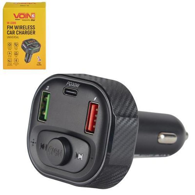 FM-модулятор VOIN W-3386 — багатофункціональний пристрій для вашого авто, що поєднує FM-трансмітер, Bluetooth 5.0, швидке заряджання та режим Hands Free. Завдяки двом USB-портам (4.8A) і одному Type-C PD 30W, він дозволяє одночасно заряджати кілька гаджетів максимально швидко. Характеристики товару: Живлення: 12–24 В Bluetooth: 5.0 Порти зарядки: • 2 × USB (загальна потужність 4.8A) • 1 × Type-C PD (30W) Функції: • Вбудований мікрофон Hands Free • Програвання музики через Bluetooth і FM • Вольтметр • Кнопки керування музикою • Світлове кільце навколо корпуса Переваги: • Надійна передача звуку без перешкод • Швидке заряджання сучасних пристроїв • Просте підключення і автоматичне відновлення з’єднання • Контроль стану акумулятора • Компактний і стильний дизайн