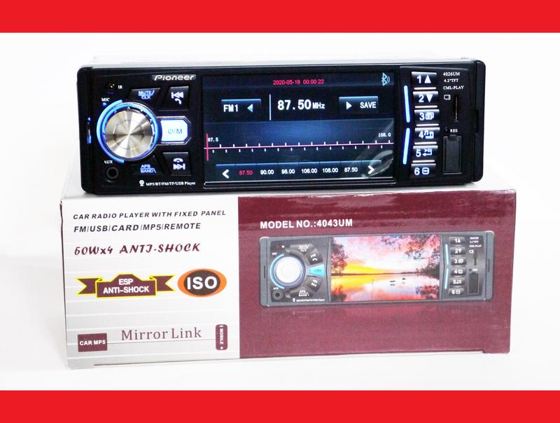 Автомагнитола MP5 Pioneer 4026UM экран 4.1 Bluetooth AV-in Пульт на руль Автомагнитола 4026UM – новая автомагнитола с возможностью воспроизведение не только файлов MP3, но и видео (есть экран LCD 4.1'' , видео выход). Несмотря на невысокую цену, магнитола воспроизводит видео и аудио файлы громко и качественно. Стильный дизайн, многофункциональность и доступная цена – делают 4026UM делают лидером на рынке автомобильной электроники. Экран с диагональю 4,1 дюйма. USB разъем для воспроизведения музыки и видео с флешки, микро SD разъем для воспроизведения музыки и видео с данного типа носителя информации. Есть видеовыход для подключения дополнительного монитора или навигатора с видеовходом. Есть видео вход для подключения камеры заднего вида и других устройств Подсветка есть. RGB Съёмная панель нет Типоразмер 1 DIN, полушахта Цвет Черный Дисплей TFT HD, 4,0 дюйма Входы USB, SD, MMC, AUX Усилитель есть Пиковая мощность 4x45 Вт Инфракрасный пульт есть MP3-проигрыватель есть Аудио форматы MP3, WMA, WAV, FLAC, OGG, APE Видео форматы RM, RMVB, DVD(VOB), VCD(DAT), MP1, MP2, DIVX, XVID, MP4, H263, H264, FLV, 3GP, SWF, AVI, ASF, MJPEG FM тюнер есть, цифровой Автопоиск станций есть, с диапазоном 87,5-108.00 MHz Часы есть Эквалайзер есть Эффекты Flat, Jazz, Rock, POP, Classic, LOUD Регулировка тембра есть Функция отключения звука. Комплектация 4026UM: 1 х автомагнитола 4026UM 1 х полушахта 1 х провода с разъемами 1 х пульт ДУ 1 х инструкция на английском 1 х упаковка