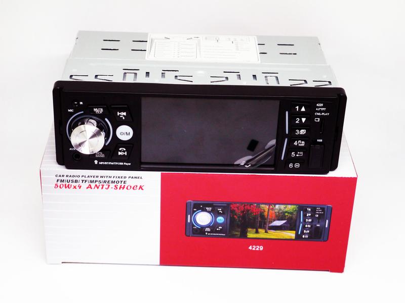 Автомагнитола MP5 4229 экран 4.1 Bluetooth AV-in Пульт на руль 4229 – новая автомагнитола с возможностью воспроизведение не только файлов MP3, но и видео (есть экран LCD 4.1'' , видео выход). Несмотря на невысокую цену, магнитола воспроизводит видео и аудио файлы громко и качественно. Стильный дизайн, многофункциональность и доступная цена – делают 4229 делают лидером на рынке автомобильной электроники. Экран с диагональю 4,1 дюйма. USB разъем для воспроизведения музыки и видео с флешки, микро SD разъем для воспроизведения музыки и видео с данного типа носителя информации. Есть видеовыход для подключения дополнительного монитора или навигатора с видеовходом. Есть видео вход для подключения камеры заднего вида и других устройств Подсветка есть. RGB Съёмная панель нет Типоразмер 1 DIN, полушахта Цвет Черный Дисплей TFT HD, 4,0 дюйма Входы USB, SD, MMC, AUX Усилитель есть Пиковая мощность 4x45 Вт Инфракрасный пульт есть MP3-проигрыватель есть Аудио форматы MP3, WMA, WAV, FLAC, OGG, APE Видео форматы RM, RMVB, DVD(VOB), VCD(DAT), MP1, MP2, DIVX, XVID, MP4, H263, H264, FLV, 3GP, SWF, AVI, ASF, MJPEG FM тюнер есть, цифровой Автопоиск станций есть, с диапазоном 87,5-108.00 MHz Часы есть Эквалайзер есть Эффекты Flat, Jazz, Rock, POP, Classic, LOUD Регулировка тембра есть Функция отключения звука. Комплектация 4229: 1 х автомагнитола 4229 1 х полушахта 1 х провода с разъемами 1 х пульт ДУ 1 х инструкция на английском 1 х упаковка