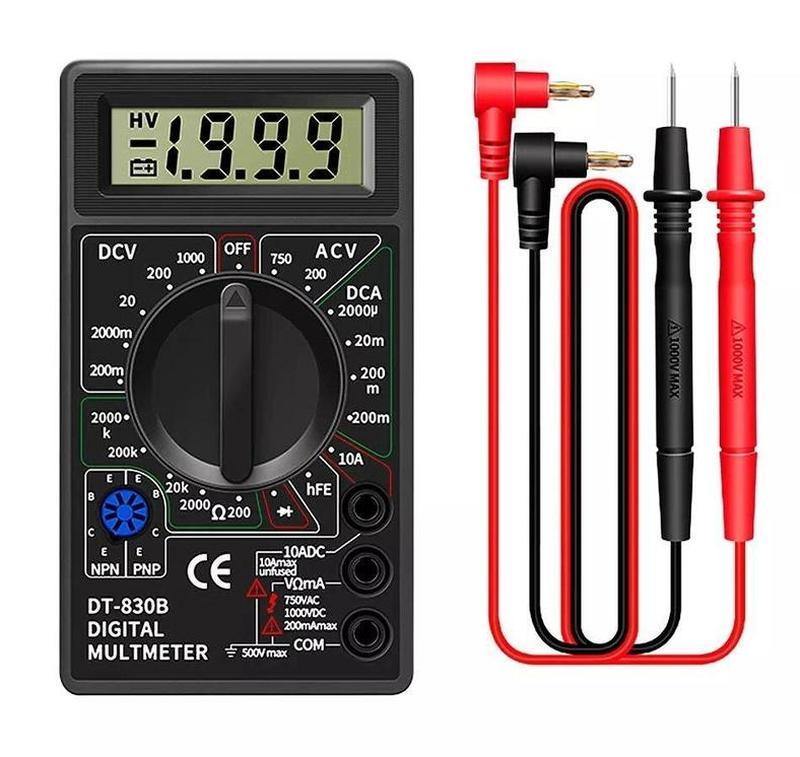 Вид приладу: Мультиметри МУЛЬТИМЕТР DT-830B Складається з: -дисплей ж/к -перемикач багатопозиційний -гнізада для під'єднання щупів -панель для перевірки транзисторів -задня кришка (потрібна для заміни елемента живлення приладу, елемент типу "Крона" 9 вольтів) Положення перемикача розділені на сектор: DCV — вимірювання напруги постійного струму (вольтметр) ACV — вимірювання напруги змінного струму (вольтметр) hFe — сектор ввімкнення вимірювання транзисторів. 1.5v-9v — перевірка елементів живлення. 10 А — сектор амперметра для вимірювання великих значень постійного струму (по інструкції вимірювання проводяться впродовж декількох секунд). Діод-сектор для перевірки діодів. Ом-сектор вимірювання опору. DCA — вимірювання постійного струму (амперметр). Характеристики вимірювань DT830B Функція Межа вимірювань Точність DCV 200m—2000m—20—200—1000V +/–0.5% ACV 200—750V +/–1.2% DCA 2000μ-20m-200m +/–1.2% OHM 200—2000—20k—200k-2000k +/–1.0% Тест діодів 3V/0.8mA hFE Vceo3V, Ibo10µA Розмір/вага 126×70×28mm/137g Країна-виробник: Китай Тип: мультиметр Призначення: вимірювальні прилади Принцип дії: електронний Тип: переносний Тип екрана: цифровий