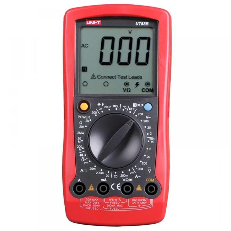 Виробник: UNIT Вид приладу: Мультиметри Кілька примірників у наявності Мультиметр Unit UT58D Цифровий мультиметр UNI-T UT-58B призначений для вимірювання постійної та змінної напруги, сили постійного та змінного струму, опору, ємності, температури, частоти, виконання перевірки діодів, транзисторів та тестування на провідність. Особливістю цифрового мультиметра UNI-T UT58В є функція утримання результатів вимірювань, перевірки на провідність зі звуковою сигналізацією. Технічні характеристики цифрового мультиметра UNI-T UT-58B: Постійна напруга: 200 мВ/2/20 В/200/1000 В; 0,5% +1 Є.М.Р. Змінна напруга (частота від 40 Гц до 1 кГц): 2/20 В/200/750 В; 0,8% +3 е.м.р. Опір: 200 Ом/2 кОм/20 кОм/2 МОм/20 МОм/200 МОм; 0,8% +1 Є.М.Р. Місткість: 2нФ/200 нФ/100 мкФ; 4,0% +3 е.м.р. Постійний струм: 2 мА/20 мА/200 мА/20 А; 0,8% +1 Є.М.Р. Змінний струм (частота від 40 Гц до 1 кГц): 2 мА/200 мА/20 А; 1,0% +3 е.м.р. Частота: 2 кГц/20 кГц; 1,5% +5 е.м.р. Температура: від -40 ° С до 1000 ° С; 3,0% +7 Є.М.Р. Дисплей: 60 x 54 мм, 2000 відліків Живлення: 9,0 В, тип 6F22 Габарити: 179 x 88 x 39 мм Вага: 350 г Функціональні можливості: Тестування транзисторів Тестування діодів Продзвонювання ланцюга Функція HOLD Автоматичне відключення Автоматичний вибір діапазону Індикація підключених щупів Комплектація: Цифровий мультиметр UNI-T UT-58B Вимірювальні щупи Термопара Батарея Інструкція користувача Виробник: UNIT Країна виробник: Китай Тип: Цифровий Стан: Новий