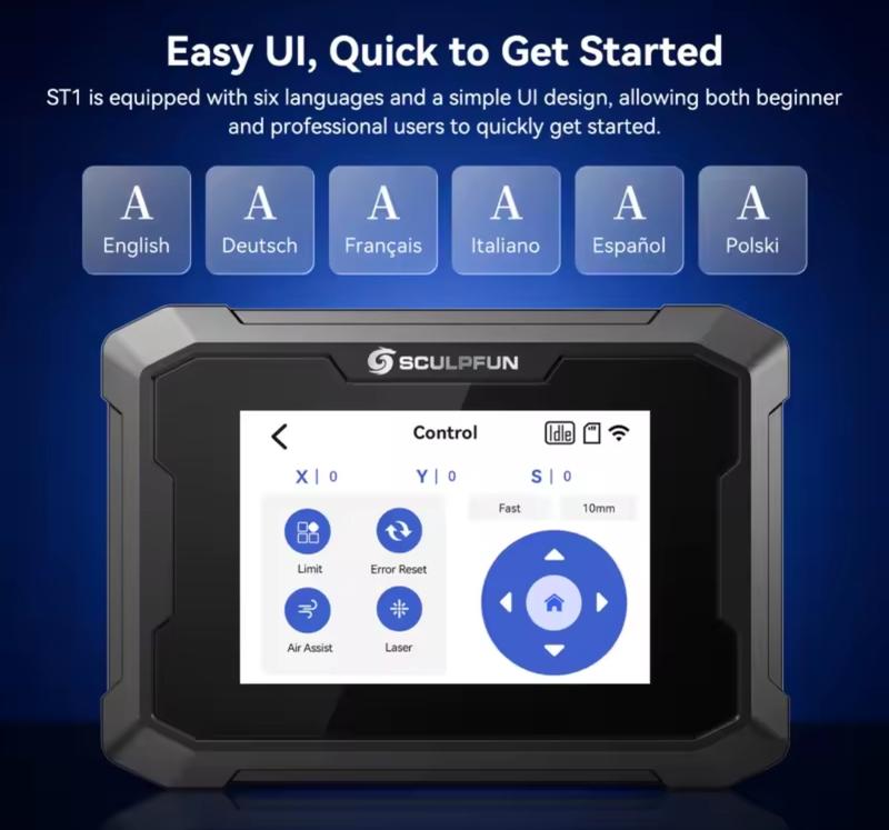 Назначение: Используется для автономной работы (офлайн) лазерного гравера. Он позволяет управлять гравировкой без постоянного подключения к компьютеру. Тип экрана: Емкостный сенсорный экран (Capacitive Touch Screen). Размер/Разрешение: 3,5 дюйма, 480x320P. Функции: Поддерживает загрузку файлов на SD-карту для офлайн-гравировки, а также удаленное управление через Wi-Fi с ПК или мобильного приложения. Совместимость: Совместим с большинством лазерных гравировальных машин.