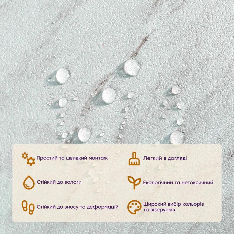 Самоклеящееся напольное покрытие LVT – многослойное виниловое покрытие, изготовленное методом горячего прессования. Основой для него служит поливинилхлорид, который сочетается с различными пластификаторами и стабилизаторами. Оно обладает великолепной визуальной схожестью с натуральными материалами, благодаря современным технологиям печати и тиснения способно идеально имитировать текстуру, цвета и внешний вид дерева, камня, мрамора и других природных материалов. Кроме того, оно обладает влагостойкостью, износостойкостью и легкостью монтажа. Материал изготовления: PVC Размер: 457*457*1,5 мм Вес 1 плиты: 550 г Текстура материала: гладкая, глянцевая, матовая или полуматовая Слои материала: - УФ-покрытие - Защитный слой: полимерный слой, обеспечивающий долговечность и защиту от трения - Декоративный слой: пленка с цветной печатью, которая полностью передает фактуру и узор дерева, камня, мрамора и других материалов - Основной слой: PVC, обеспечивает прочность и стабильность - Нижний слой - Клеевой слой: нетоксичная основа с высокой адгезией - Защитная силиконизированная бумага Применение: ремонтно-отделочные работы в коммерческих и бытовых помещениях разного назначения, общественных и медицинских учреждениях, фитнесс-центрах и отелях. Подходит для спален, гостиных, кухонь, ванных комнат, лестниц, благодаря влагостойкости, устойчивости к загрязнениям и легкому уходу. Может использоваться как самостоятельное покрытие, для декора или обновления старого напольного покрытия. Свойства и преимущества материала: 1. Легкое и быстрое самоклеящееся крепление без специалистов и специальных инструментов. 2. Имитация натуральных материалов с выдающимся реализмом. 3. Экономия времени и усилий при установке. 4. Пластичность и простота обрезки. 5. Прочность и долговечность. 6. Устойчивость к износу, влаге и морозу. 7. Уровень шумо- и теплоизоляции. 8. Легкий уход и разнообразие цветов и текстур. 9. Экологическая безопасность. Инструкция по использованию: 1. Определите площадь покрытия. 2. Подготовьте поверхность: она должна быть сухой, ровной и чистой. 3. Приклеивайте плиты, постепенно снимая защитный слой бумаги. 4. Плотно проклеивайте плиты к полу. 5. Укладывайте плиты стык в стык.