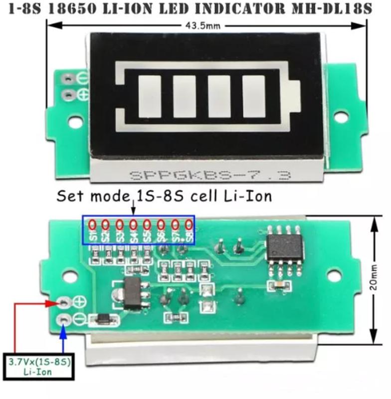 Подключение модуля к аккумуляторной батарее осуществляется через контактные площадки «+» и «-», расположенные на плате. Модуль имеет защиту от переполюсовки . Устройство является универсальным для использования с Li-ion аккумуляторами. Плата модуля позволяет проводить индикацию уровня заряда Li- ion батарей от 1 до 8 последовательно соединенных элементов (1S-8S). На примере одной ячейки (1S) индикация полного заряда находится на уровне 4,2 В (100%), 3,66 В (50%) 2,5-3,0 В (0% разряд). При напряжении менее 2,5 В подсветка индикатора гаснет полностью. В зависимости от числа аккумуляторов и установленной перемычки на плате пороговые значения будут соответствующие и кратны числу элементов Li-ion. Перемычка устанавливается в одно положение, равное числу проверяемых аккумуляторных батарей (АКБ). Ток потребления индикатора около 5 мА и не зависит от количества подсвечиваемых светодиодов, яркость индикатора уменьшается по мере загорания дополнительных светодиодов, тем самым поддерживается фиксированное энергопотребление модуля. Индикатор при разряде АКБ имеет красное свечение вокруг параллельных полос уровня заряда. Универсальный индикатор заряда MH-DL18S имеет транспортировочную пленку, после удаления которой наблюдается матовая поверхность корпуса. Индикатор уровня заряда 1-8-х Li-ion элементов 18650 Размер модуля : 45 x 20 х 7 мм Размер дисплея 31 х 20 мм Цвет свечения синий Подключение: Подключение производится к двум контактам на плате, помеченные знаками (-) и (+) подключите их к аккумулятору, используя соединительные провода. Режимы индикации: Если напряжение батареи превышает 9,9 В, отображаются одна полоска индикатора Если напряжение батареи превышает 10,5 В, отображаются две полоски индикатора Если напряжение батареи превышает 11,1 В, отображаются три полоски индикатора Если напряжение батареи превышает 11,7 В, отображаются четыре полоски индикатора Если напряжение аккумулятора меньше, чем 9,9 В, дисплей из 4 полосок индикатора не светится - аккумулятор необходимо зарядить.
