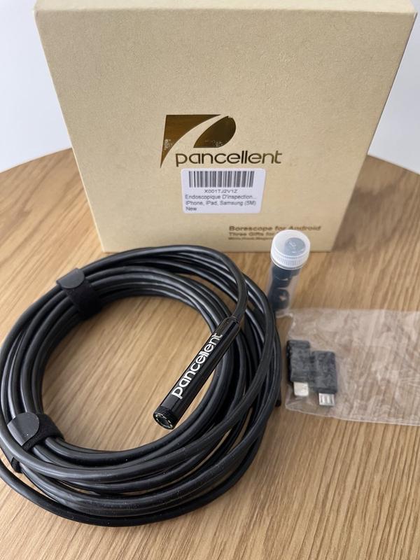 призначену для використання з Android-пристроями (телефонами, iPad, Samsung). Це ендоскоп-бороскоп, що дозволяє проводити візуальний огляд важкодоступних місць. Він сумісний з різними пристроями Android, включаючи телефони, iPad та Samsung. Камера має довгий кабель, що забезпечує гнучкість при використанні. У комплекті, ймовірно, є адаптери для підключення до різних портів (наприклад, USB-C, Micro-USB), як показано на зображенні. Цей пристрій корисний для інспекції труб, двигунів, електропроводки та інших місць, де потрібен візуальний доступ без демонтажу.