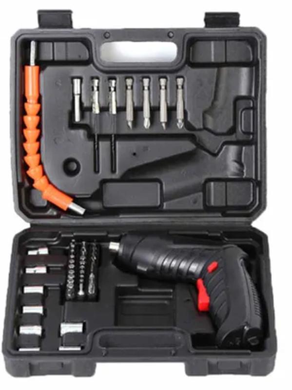 Шуруповерт аккумуляторный поворотный с насадками 47 в 1 USB в чемодане Портативный шуруповерт - TUOYE 47PCS в компактном пластиковом кейсе с большим количеством насадок и встроенной литиевой батареей, которая обеспечивает мощность устройства, а также подсветку рабочей зоны. Затеяли ремонт, вешаете картину, собираете шкаф или гардероб? Этот шуруповерт справится со всеми этими задачами и еще со многими другими. Компактный, с отличным балансом, удобно и приятно лежит в руке. Станет надежным помощником при необходимости открутить или закрутить крепеж, просверлить отверстия. При нажатии на спусковой механизм светодиодный светильник автоматически включается, поэтому плохое освещение в сложных отверстиях не будет мешать. Аккумуляторная отвертка оснащена литиевой батареей емкостью 1300 мАч, которая может обеспечить большую емкость и более длительный срок службы. А входящий в комплект кабель для зарядки micro USB подходит для различных интерфейсов USB. Время зарядки составляет 2-3 часа. Большой выбор различных насадок - 45 шт, позволяют выполнять огромный спектр различных работ. Используйте инструмент как дрель для дерева или для выкручивания/вкручивания саморезов. Также в комплекте есть два сверла которые расширяют возможности инструмента. Аккумуляторная отвертка имеет особенность - поворот корпуса на 90°, т.е. позволяет держать инструмент как шуруповерт и как отвертку. Чтобы изменить форму шуруповёрта, необходимо удерживая красную кнопку в верхней части корпуса, повернуть по оси на 180°. Вы можете легко изменить форму электродрели, нажав кнопку. Вращающаяся резиновая рукоятка делает инструмент гибким и адаптируемым к различным условиям работы. Имеет основное и реверсивное направление вращения, а также нейтральное положение, в котором блокируется вращение, работает только фонарик, регулируется кнопками по бокам. Функции: - быстрозажимной патрон - светодиодный фонарь - кнопка конвертации - переключатель вперед\назад Характеристики: Рабочее напряжение: 3,6V Емкость аккумулятора: 1300мАч Скорость без погрузки: 200 об/мин Размер: 21,5 см Порт зарядки: порт USB (Type-C) Кабель для подзарядки: 34 см Время зарядки: 2-3 часа Комплектация: Шуруповерт - 1шт Кабель зарядки - 1шт Насадки - 45шт - Отвертка аккумуляторная Зарядное устройство Переходник для головок Головки шестигранные: 13, 12, 11, 10, 9, 8, 7, 6 мм Биты: Т45, Т40, Т30, Т27, Т25, Т20, Т15, Т10 Н6, Н5, Н4, Н3.5,Н3, Н2.5, Н2 PH3, PH2, PH1, PH0 PZ3, PZ2, PZ1, PZ0 SL7, SL6, SL5, SL4, SL3 Удлинитель для бит Удлиненные биты: SL5, SL6, PH1, PH2, PZ1, PZ2. Инструкция - 1шт Кейс - 1шт Размеры: Шуруповерт - 13,5х13 см Отвертка - 21,5 см Кейс - 23х16,5х17 см