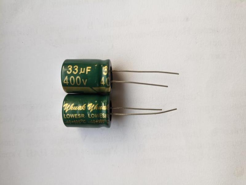 Тип оборудования: Конденсаторы Цена указана за 2шт. Конденсаторы электролитические 33mkF*400V, -40-+105°C, Yhuak. Фактическая емкость – 28-30 mkF Фактический ESR<2,1 Ohm. Размер 13*18 мм.