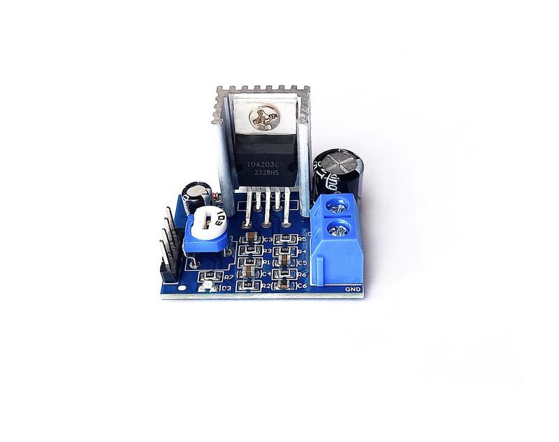 TDA2030 Audio Amplifier Board Module Плата усилителя усилитель низкой частоты класса AB TDA2030A с регулятором усиления громкости. Микросхема обладает низким коэффициентом нелинейных искажений, имеет встроенную теплозащиту (отключение при 145°C) и защиту от короткого замыкания. • Светодиодная индикация (красный LED-индикатор) при подключении питания. • Регулировка громкости: Встроенный подстроечный резистор (потенциометр) Характеристики: • Тип усилителя: Моно аудио усилитель • Рабочее напряжение: 6...12В • Класс усилителя: AB • Максимальная выходная мощность: 18Вт • Максимальный потребляемый ток: 1.5 А • Пиковый выходной ток: 3 А • Ток в режиме покоя: 50 мА • Рабочая температура: -40 ... +85°C • Сопротивление динамика: 4-8 Ом • Встроенный индикатор питания • Цвет платы: Синий • Размеры платы: 32,5 х 24,2 мм • Вес: 11,4 гр. Подключение: • Входной штыревой разъем для подключения источника сигнала: (IN, GND) • Выходной разъем, двухконтактный клеммник под винт: (OUT+, OUT-) • Входной штыревой разъем питания: (VCC, GND)
