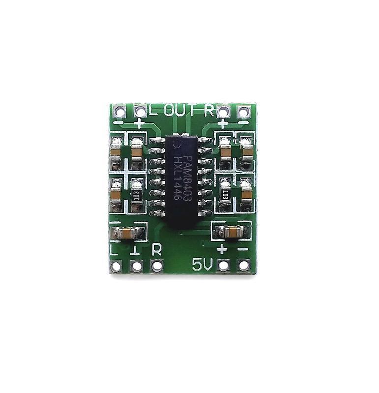 Стерео усилитель на микросхеме PAM8403 2 х 3 Вт Характеристики: • Стерео аудио усилитель D-класса • Выходная мощность: 2 х 3 Вт при 4 Ом, 2 х 1.5 Вт при 8 Ом • Напряжение питания: 2,5-5,5В • Уровень сигнал/шум: 80дБ • Коэффициент нелинейных искажений: не более 0,15% при выходной мощности 1Вт, нагрузке 4Ом, питании 5В • КПД: до 90% • Диапазон рабочих температур: -40 … +85°C • Размеры модуля: 19 х 21 х 3 мм