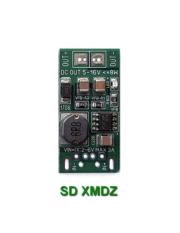 Підвищувальний DC-DC-перетворювач SD XMDZ 12 В Підвищувальний перетворювач напруги, максимальна вихідна потужність 8 Вт. На платі модуля є розведення під розпаювання гнізда USB. Характеристики SD XMDZ: • Назва бренда: EC Buying • Номер моделі: 8W Step Up Module • Вхідна напруга: DC 2-6В • Вихідна напруга: DC 12В • Точність вихідної напруги: ±2% • Максимальна вих. потужність: 8 Вт • Максимальний ККД: 90% • Робоча частота: 1 МГц • Струм спокою: 40-250 мкА (з вмик. світлодіодом) • Діапазон робочої температури: -40...85°C • Розміри: 16 x 33 мм - для 9В R2=210к 2103 - для 12В R2=287к 2873 SMD chip: ME2149F Діод Шоттки SS34