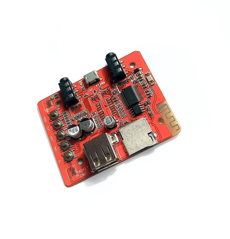 Аудио модуль BT2 с поддержкой Bluetooth, USB Flash и MicroSD Кнопки управления - переключение режимов, играть/пауза, следующий трек, предыдущий трек, эквалайзер. Возможно управлять смартфоном - ставить на паузу, перематывать и переключать треки. Разъем для подключения USB Flash и MicroSD. Аудиовход, аудиовыход и разъём для подключения питания Micro USB. Плата определяется как BT2-10. При переключении режимов, с Bluetooth на карты памяти, плата сигнализирует голосом. Характеристики: Источник питания: 5 В Bluetooth: 15 метров Медиа-порт: Порт USB и мультимедийный порт TF play Аудио вход: AUX 3,5 мм Аудио выход: AUX 3,5 мм Размеры: 62 х 50 мм