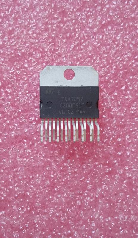 Підсилювач низької частоти TDA7297 Multiwatt 15 15W + 15W dual bridge amplifier Виробник STMicroelectronics Технічні дані Корпус Multiwatt 15 Напруга живлення 6-18V Потужність 2x15W / 8 Ohm ПНЧ 2-канальний мостовий підсилювач потужності виготовлений у корпусі Multiwatt 15 Мікросхема встановлюється на радіатор, кріпиться одним кріпленням Спектр напруги живлення мікросхеми від 6 В до 18 В. Вихідна потужність становить 2 × 15 Вт Робоча температура від 40 °C до +150 °C. Двоканальний стереопідсилювач обладнаний функцією Mute, має вбудований термозахист і захист від короткого замикання. Під час монтажу пристрою застосовується незначна кількість зовнішніх компонентів.TDA7297 широко застосовується в побутових аудіосистемах, телевізорах, радіоприймачах, сучасних магнітолах