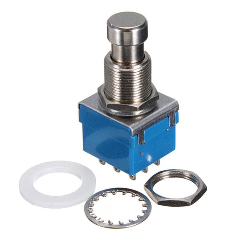 3PDT кнопка c фиксацией под пайку для педалей и футсвичей. Три группы контактов: коммутация входа, выхода и индикация работы педали Пассивный обход (True Bypass) В комплекте 2 гайки, пластиковая и металлическая шайбы