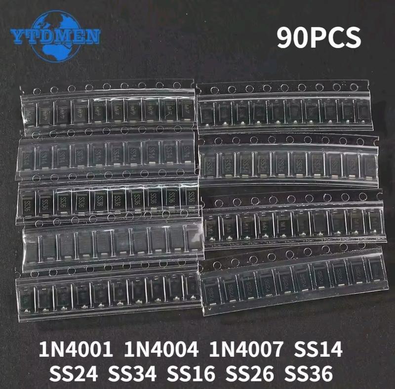 Набор диодов (90 шт) - 1n4001, 1n4007, ss14, ss24, ss34, ss16, ss26, ss36