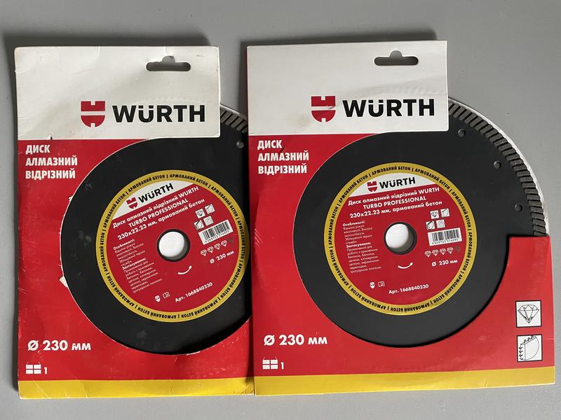 Алмазний відрізний круг. Бруківка та армованому бутону 230мм -WURTH TURBO. -WURTH TURBO PROFESSIONAL. В наявності 6 штук Застосування: Призначений для роботи з армованим бетоном, бетоном, цеглою, клінкерною цеглою, керамічною черепицею, тротуарной плиткою Відправка нова та укрпочта