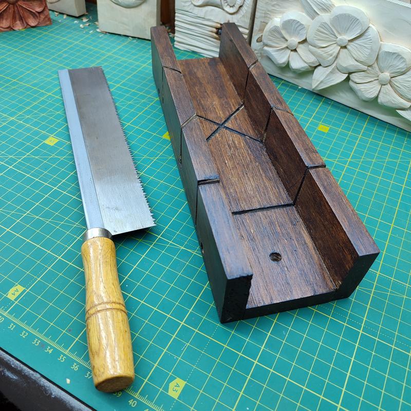 Стусло деревянное с пилкой с мелким зубом для зарезки плинтусов, штапиков под прямым углом и углом 45 градусов.