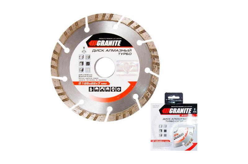 Алмазний диск "Granite" призначений для сухого різання будівельних матеріалів, таких як бетон, цегла, камінь, граніт, вогнетривкий матеріал. Використовується на УШМ, ручному електричного плиткоріз, штроборізи. Складається з алмазних сегментів і сталевого корпусу. Має унікальну функцію самозатачіванія. Насиченість алмазами не менше 22%. Діаметр диска 125 мм. Розмір отвору 22,2 мм.