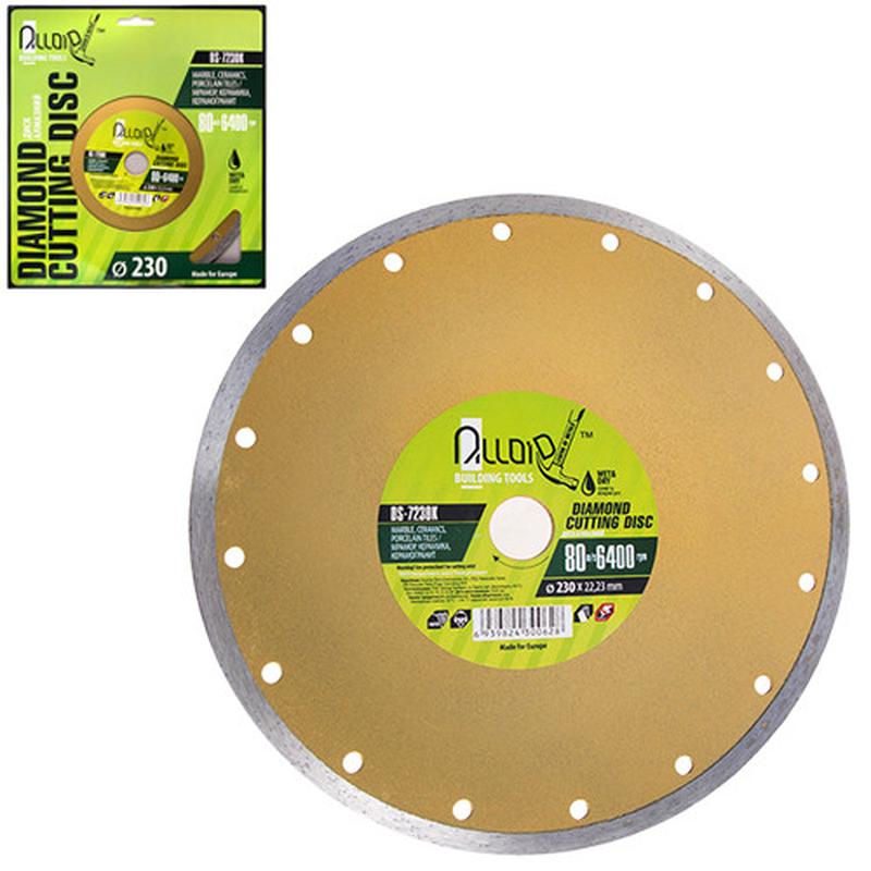 Алмазний відрізний диск із суцільною кромкою 125 мм Alloid – ідеальний для чистого різу Опис: Алмазний відрізний диск Alloid із суцільною ріжучою кромкою створений для максимально точного та акуратного різу твердих матеріалів. Оптимально підходить для керамічної плитки, керамограніту, мармуру та скла. Суцільна кромка з високоякісним алмазним напиленням забезпечує рівний та гладкий різ без відколів. Переваги: - Ідеальний для кераміки – чистий та точний різ без сколів. - Суцільна кромка – рівномірний розподіл навантаження для довговічності. - Високоякісне алмазне напилення – ефективна та тривала робота. - Підходить для мокрого та сухого різу – універсальність застосування. - Мінімізація вібрацій – плавний і комфортний процес різання. - Стандартний посадковий діаметр 22,23 мм – сумісність із більшістю кутових шліфувальних машин. Алмазний відрізний диск Alloid DS-7230К є професійним знаряддям, яке ідеально підходить для здійснення пильних операцій. Алмазний відрізний диск DS-7230К від Alloid є високопрофесійним інструментом. Диск виготовлений з високоякісного сплаву, що гарантує йому надзвичайну міцність та довговічність. ПЕРЕВАГИ ВІДРІЗНОГО АЛМАЗНОГО ДИСКА DS-7230К: Висока міцність: завдяки високоякісному алмазному напиленню висотою 7 мм, відрізний диск Alloid відрізняється надзвичайно високою зносостійкістю. Ідеальне балансування: за рахунок високоякісних матеріалів, правильної форми та точно відцентрованої посадки на електроінструмент, диск має ідеальне балансування. Універсальність: інструмент підходить як для сухого, так і для вологого різу різних середньо абразивних матеріалів, які використовуються в ремонтних та будівельних роботах. Цей тип дисків використовується для точного різання без сколів, що особливо важливо для керамічної, мармурової, гранітної плитки, декоративного каменю. Найкращі результати досягаються при використанні мокрого різу. Даний витратний матеріал має високу якість, завдяки чому підходить як для побутового, так і для професійного використання. ALLOID - ІНСТРУМЕНТ ДЛЯ УКРАЇНСЬКИХ МАЙСТРІВ Компанія Vitol має великий досвід роботи з професійним інструментом відомих брендів, тому добре розуміє потреби споживачів у різних сферах діяльності. Спираючись саме на потребу та запит наших клієнтів, більш ніж 10 років тому виникла ідея створення власної торгової марки інструменту, яку невдовзі було втілено в лінійці інструменту на ім’я Alloid. Першочерговою концепцією бренду Alloid було створення якісного й доступного продукту для побутового використання. Вийшовши на ринок, завдяки своїй якості та характеристикам інструмент Alloid одразу ж здобув популярність не тільки серед майстрів-аматорів, а також й серед професіоналів. Від наших клієнтів, що мали змогу оцінити якість Alloid, почали надходити запити на спеціалізований професійний інструмент та обладнання. Тоді, щоб задовільнити цю потребу, асортимент Alloid було доповнено лінійкою спецінструменту та обладнання для СТО. Наразі інструмент Alloid активно використовується майстрами на професійних СТО, у промисловості та виробництві, у будівництві та ремонті, а асортимент бренду налічує більш ніж 5000 найменувань універсального, автомобільного та будівельного інструменту. Ми гарантуємо якість інструменту Alloid, адже несемо повну відповідальність на всіх етапах виробництва – від роз