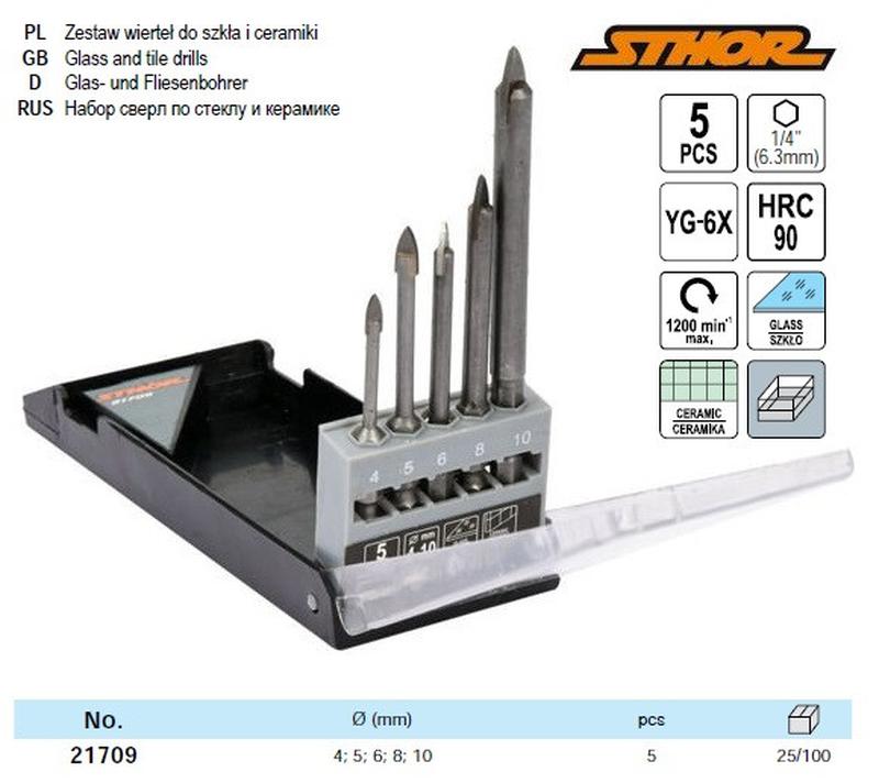 Набор сверла по стеклу и керамике польша ø=4, 5, 6, 8, 10 мм yg6x hex-1/4" 5 штук sthor-21...