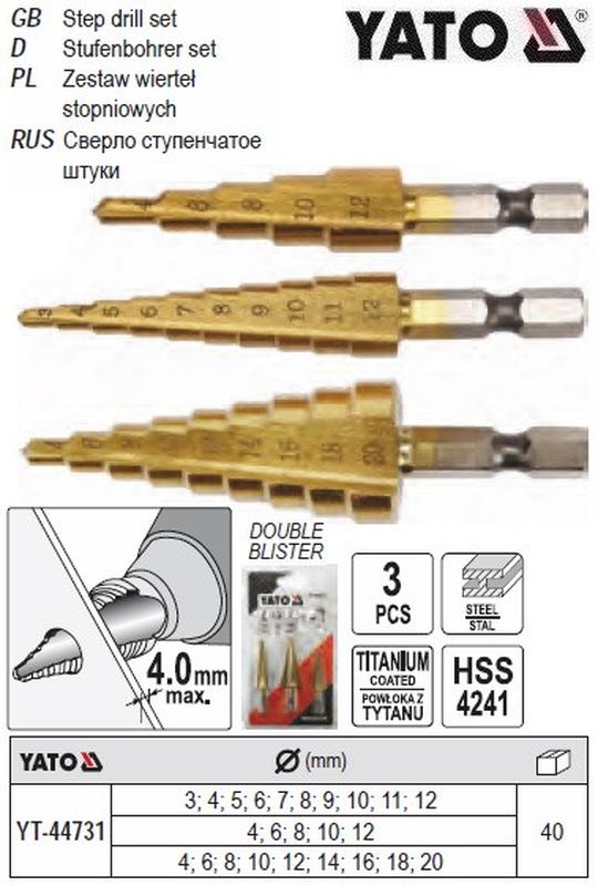 Набор сверло коническое yato титан hex-1/4" ø=3-12 мм, 4-12 мм, 4-20мм 3 штуки yt-44731