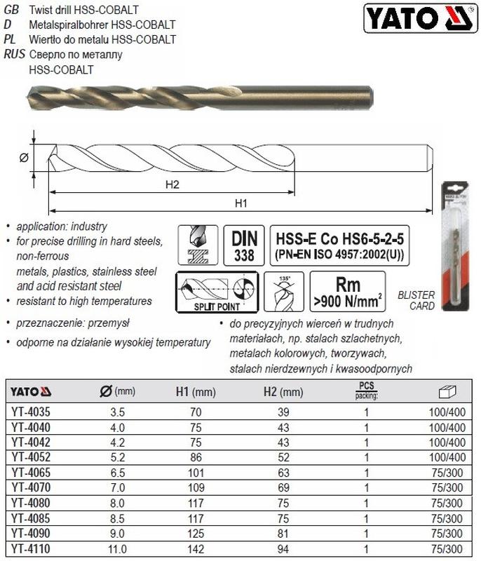 Сверло yato по металлу кобальт hss ø=8,0 мм l=117/75 мм yt-4080