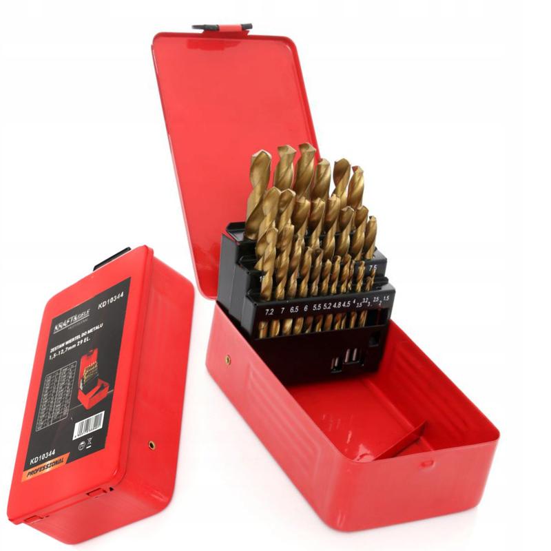 ТИТАНОВІ СВЕРДЛА ПО МЕТАЛУ 29 шт KRAFT&DELE KD10344 Титанові свердла, на відміну від білих, більш міцні і менш абразивні. Використовується для сталі, чавуну, кольорових металів і пластмас. Свердла мають кут загострення 118 градусів, тому немає необхідності в попередньому «наведення», тобто попередньому розміченні отворів перед фактичним свердлінням. Якісні свердла з покриттям TITANIUM мають корекцію фаски, що дозволяє добре центрувати при свердлінні. Свердла характеризуються високою гнучкістю, отриманою в результаті відповідної термічної обробки. Ризик поломки свердла менший, особливо у випадку свердел діаметром менше 6 мм. РОЗМІРИ СВЕРДЛ: - 1,5 мм (1/16 дюйма) - 2,0 мм (5/64 дюйма) - 2,5 мм (3/32 дюйма) - 3,0 мм (7/64 дюйма) - 3,2 мм (1/8 дюйма) - 3,5 мм (9/64 дюйма) - 4,0 мм (5/32 дюйма) - 4,5 мм (11/64 дюйма) - 4,8 мм (3/16 дюймів) - 5,2 мм (13/64 дюйма) - 5,5 мм (7/32 дюйма) - 6,0 мм (15/64 дюйма) - 6,5 мм (1/4 дюйма) - 7,0 мм (17/64 дюйма) - 7,2 мм (9/32 дюйма) - 7,5 мм (19/64 дюйма) - 8,0 мм (5/16 дюймів) - 8,5 мм (21/64 дюйма) - 8,8 мм (11/32 дюйма) - 9,0 мм (23/64 дюйма) - 9,5 мм (3/8 дюйма) - 10,0 мм (25/64 дюйма) - 10,3 мм (13/32 дюйма) - 10,7 мм (27/64 дюйма) - 11,0 мм (7/16 дюймів) - 11,5 мм (29/64 дюйма) - 12,0 мм (15/32 дюйма) - 12,3 мм (31/64 дюйма) - 12,7 мм (1/2 дюйма)