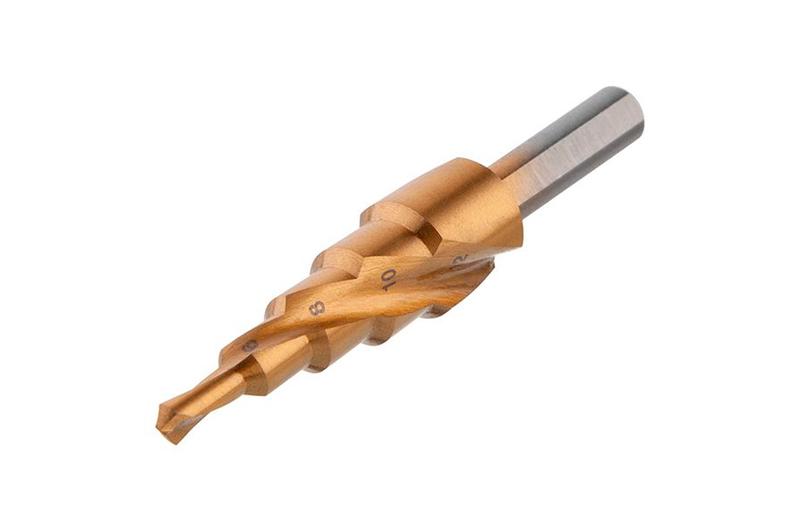 Сверло ступенчатое по металлу Intertool – отличный помощник для деликатного сверления отверстий в листовых металлах и пластике. Ступенчатая структура позволяет сверлить отверстия разного диаметра 4-12 мм, без замены режущего инструмента. Сверло имеет коническую форму, его диаметр увеличивается на 2 мм в шаге с глубиной 6 мм. Сверло изготовлено из HSS (High-SpeedSteel) стали с жесткостью по стандарту DIN 340.