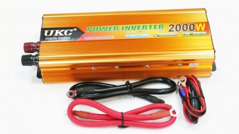 ### Автомобильный инвертор UKC SSK-2000W для преобразования электричества с 12 В в 220 В. С помощью данного приспособления можно подключить ноутбук, принтер, различную аудио- видеотехнику, электроинструмент, зарядные устройства и т.д. Подключается устройство к прикуривателю или напрямую к аккумулятору автомобиля. Корпус прибора выполнен из качественного алюминия, с одной стороны размещены клеммы для подсоединения и охлаждающий вентилятор. С другой: розетка, кнопка вкл/выкл, USB-порт, LED-индикаторы. - Подходит для применения: в автомобиле, катере, электрогенераторах и т.д. - Автоматическое отключение при низком уровне заряда аккумулятора - Автоматическое отключение при перегрузке, коротком замыкании - Автоматическое отключение при перегреве - Выходная мощность (пиковая): 2000 Вт - Номинальная мощность: 1000-1200 Вт - Входное напряжение: 12 В (10-15 В AC, постоянного) - Выходное напряжение: 220 В (AC, переменного) - Частота выходящего сигнала: 50 Гц +/- 2 Гц - Точка автовыключения при малом заряде: 9.7-10.3 В - Точка автовыключения при высоком заряде: 14.5-15.5 В - Форма выходного сигнала: модифицированная синусоида - КПД: >90% - Температура окружающей среды: от 0 до +40°C - Размер: 24.5 x 9.7 x 5.5 см - Вес: 850 г Комплектация: - Преобразователь UKC 12V-220V 2000W - Шнуры 2 шт - Переходник к 12V от прикуривателя - Инструкция - Фирменная коробка