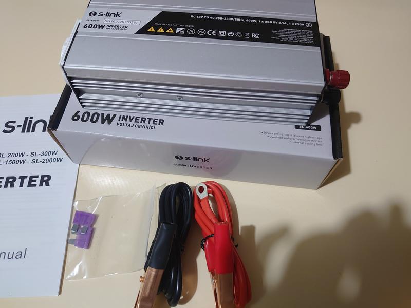 Инвертор S-link , преобразователь тока 12/220V - 600W,пиковая 1200Вт - мощный, компактный, фирменная упаковка. Сделан по европейским стандартам на экспорт для Турции! Автомобильный инвертор S-link 600 Вт. Преобразователь напряжения 12/220 - альтернативное питание приборов, работающих от сети. Автомобильный преобразователь напряжения S-link 12/220 , мощностью 600 Вт(пиковая 1200Вт) - устройство, предназначенное для подключения и использования разнообразной бытовой техники, электроинструмента, ноутбука, телефона, различной видео- и аудиотехники, а также прочих электроприборов в условиях, где нет сетевых источников питания. Например, в путешествиях на автомобиле, прогулках на катере, в гараже, на даче, в аварийных ситуациях. В качестве источника напряжения ±12 В могут применяться аккумуляторы автомобильные,тяговые,гелевые, а также ветровые и солнечные генераторы. На передней панели устройства расположены индикаторы режима работы, индикатор заряда аккумулятора, розетка для электроприборов, тумблер включения, тумблер переключения автомобильный или другой тип аккумулятора и USB-порт. Охлаждение инвертора постоянное и осуществляется при помощи кулера, установленного на задней панели прибора. Там же находятся клеммы для подключения кабеля от аккумулятора. Внутри инвертора находятся предохранители (FUSE), которые легко заменить в случае их выхода из строя. В комплекте идут запасные предохранители. При напряжении аккумуляторной батареи ±10.2-10.8 В и превышении пиковой мощности нагрузки зажигается красный индикатор. Автоматическое отключение устройства происходит при низком входном и падении выходного напряжения. S-link 12/220 , мощностью 600 Вт(пиковая 1200Вт) имеет надежную тепловую защиту, срабатывающую при температуре > 45°C, защиту от перегрузки и короткого замыкания на выходе. Автомобильный инвертор S-link 12/220 , мощностью 600 Вт(пиковая 1200Вт) - современное, компактное и надежное устройство, которое гарантированно выручит Вас в самых непредвиденных ситуациях! Экспортный вариант сделан для Турции по Европейским стандартам качества! В комплекте: - Преобразователь S-link 12/220 , мощностью 600 Вт(пиковая 1200Вт); - Кабеля для подключения инвертора от аккумулятора 2 шт.; - Запасные предохранители.