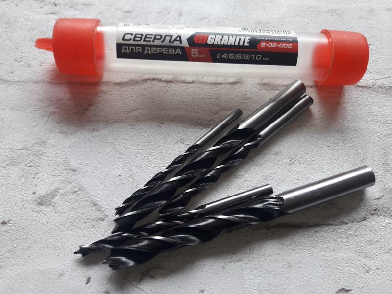 Тип інструмента: Інший вид інструменту Кілька примірників у наявності Набір свердлів Granite 2-02-005 для дерева даметр 4mm - довжина 75mm 5mm-80mm 6mm-90mm 8mm -103 мм 10mm -117mm Призначені для просвердлювання отворів у м'якій та твердій деревині з будь-яким розташуванням волокон, клеєної фанери, ДСП. Має самоценрующее вістря з двома ріжучими гранями.